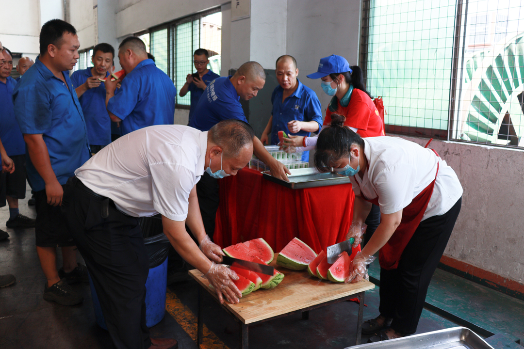 公司黨團(tuán)志愿服務(wù)隊(duì)志愿者為一線工人送上西瓜