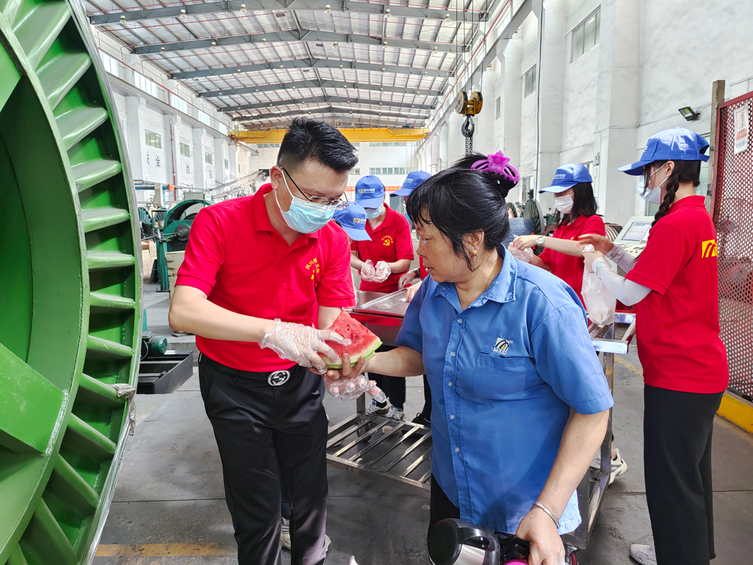 當(dāng)日下午2點(diǎn)半左右,烈日炙烤著大地,酷暑難耐。公司黨支部書(shū)記張亮、總經(jīng)辦吳總、人資部李總等領(lǐng)導(dǎo)帶領(lǐng)公司黨團(tuán)志愿服務(wù)隊(duì)志愿者們兵分多路,前往A、B、C、D、E廠區(qū)車間、機(jī)電部及倉(cāng)儲(chǔ)部、物流部高溫作業(yè)區(qū)等,為一線工人送上西瓜、冰鎮(zhèn)飲料等消暑物資。“師傅,您辛苦了,來(lái)吃西瓜?!泵康揭惶?,張書(shū)記、吳總、李總等都親切問(wèn)候一線工人,向大家高溫期間堅(jiān)守工作崗位表示深深的感謝和崇高的敬意,并叮囑大家要注意防暑,多注意身體,合理安排工作和休息時(shí)間。