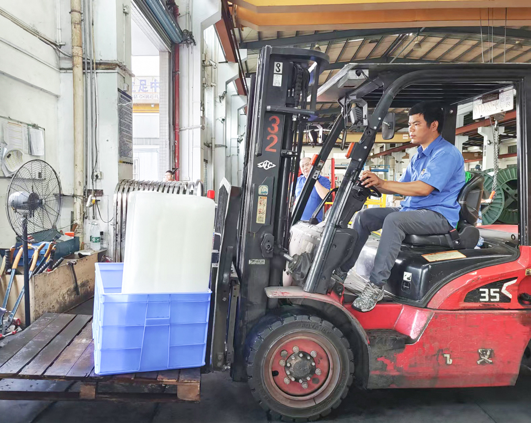 工作人員向車間及廠區(qū)主要通風(fēng)設(shè)備附近投放冰塊為工人們消暑