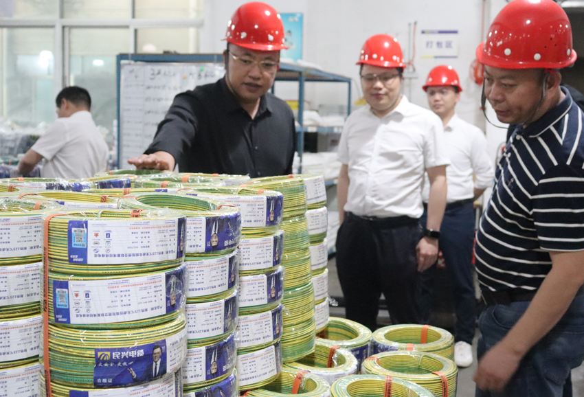 4月20日下午,應急管理部四川消防研究所國家防火建筑材料質量檢驗檢測中心主任張翔、部長馮軍,東莞市質量監(jiān)督檢測中心主任姚志慧等領導專家一行來到民興電纜,通過座談交流、走訪參觀等形式開展調研指導工作,民興電纜常務副總經理張隆放攜管理團隊陪同調研。