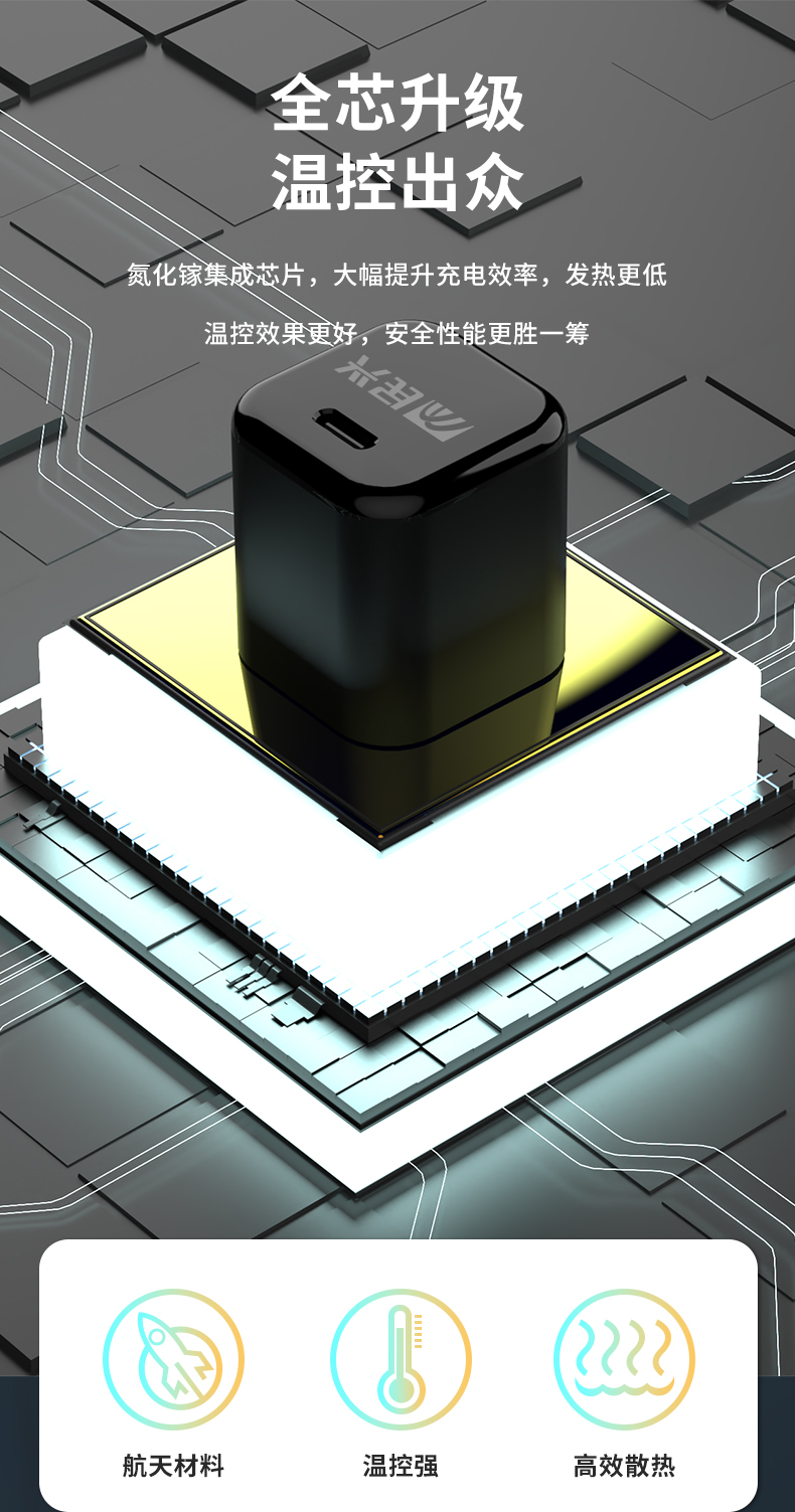 充電器內置GaN氮化鎵集成芯片,擁有更高的轉換效率,大幅提升充電速率,高效散熱,安全性能更勝一籌。